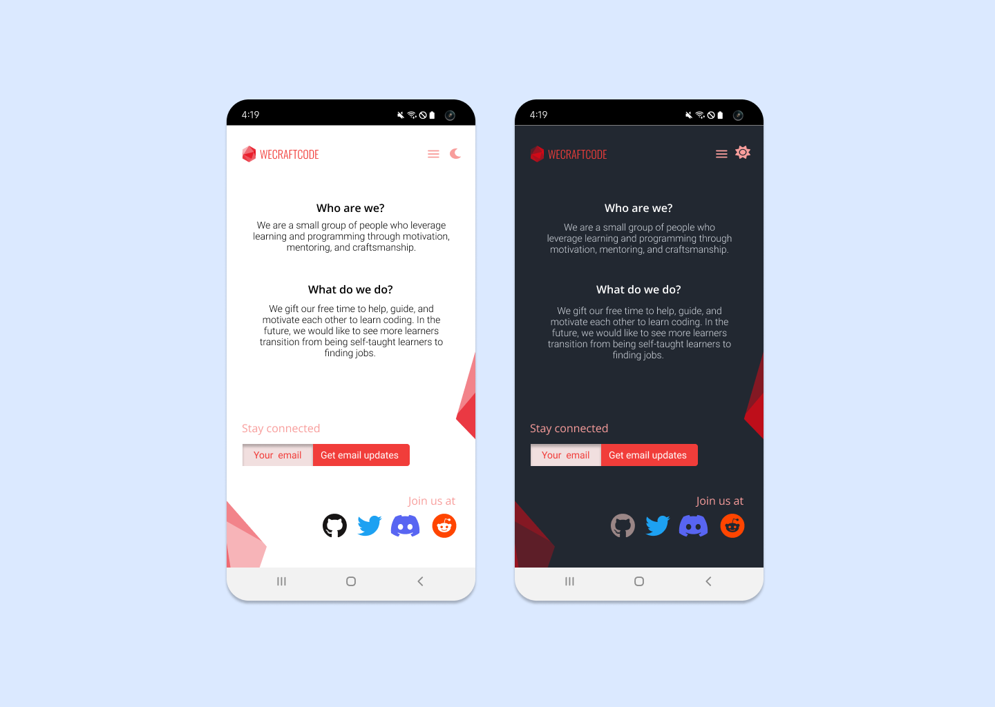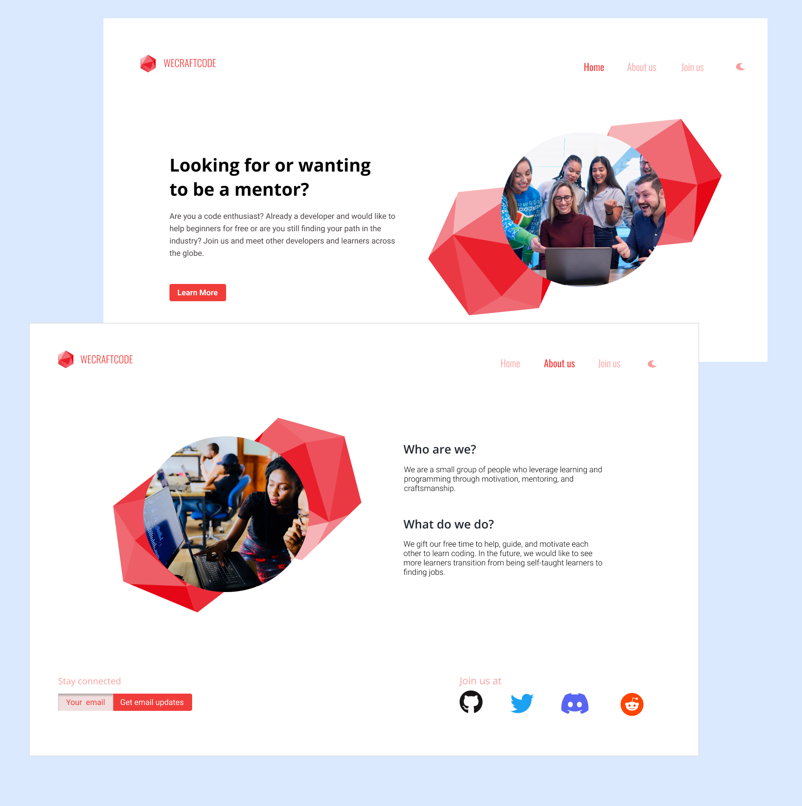 WeCraftCode is a small group of individuals who promote learning and programming through motivation, mentoring, and craftsmanship. The group is currently active on Discord. I came across them at the end of 2021 while I was participating in freeCodeCamp. When they were looking for a volunteer to design the group's website, I volunteered myself.